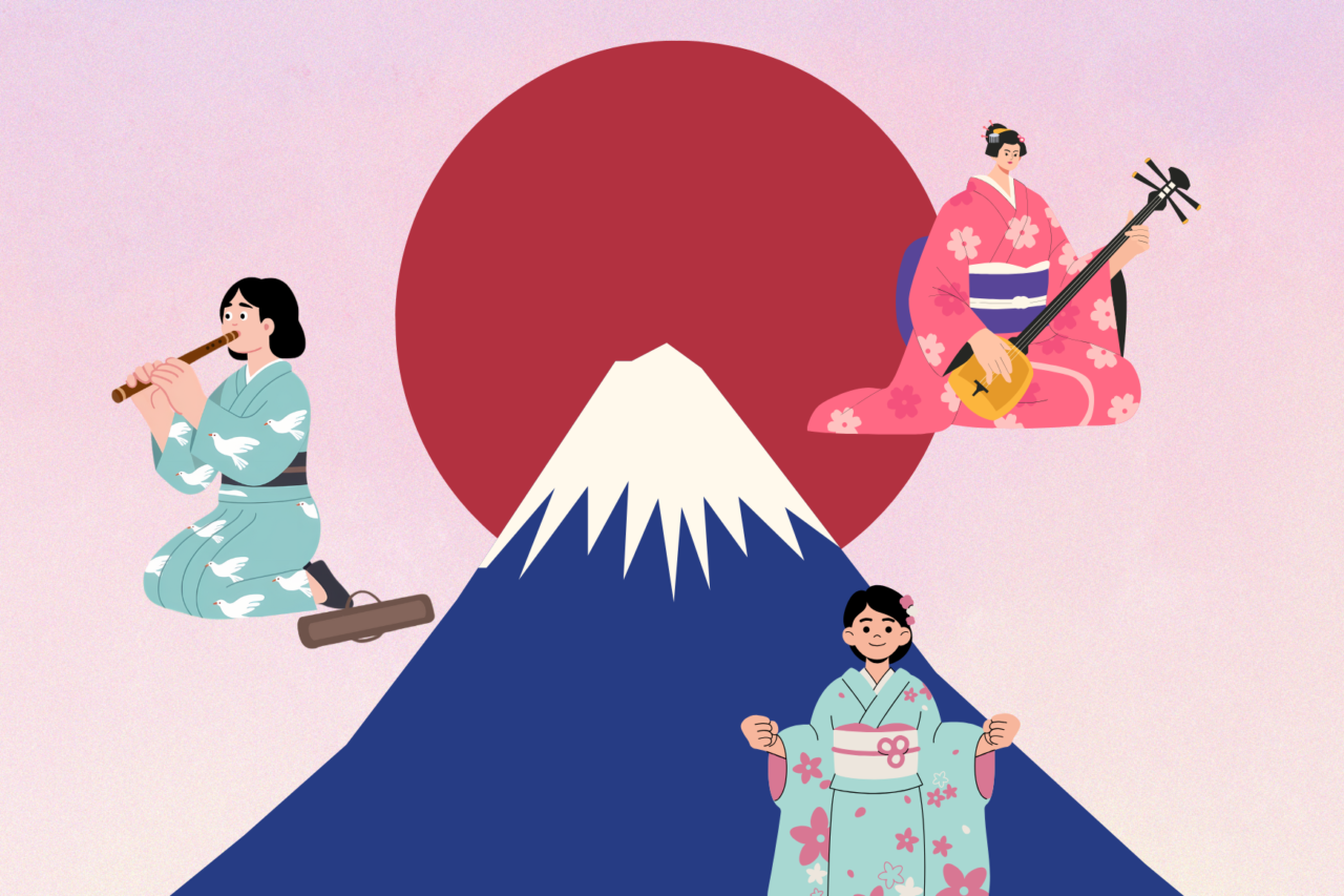 尺八(しゃくはち)、三味線(しゃみせん)、太鼓(たいこ)に合わせて山形の民謡を聞いたり、みんなで「花笠音頭」を歌います。クイズもあります。 -
