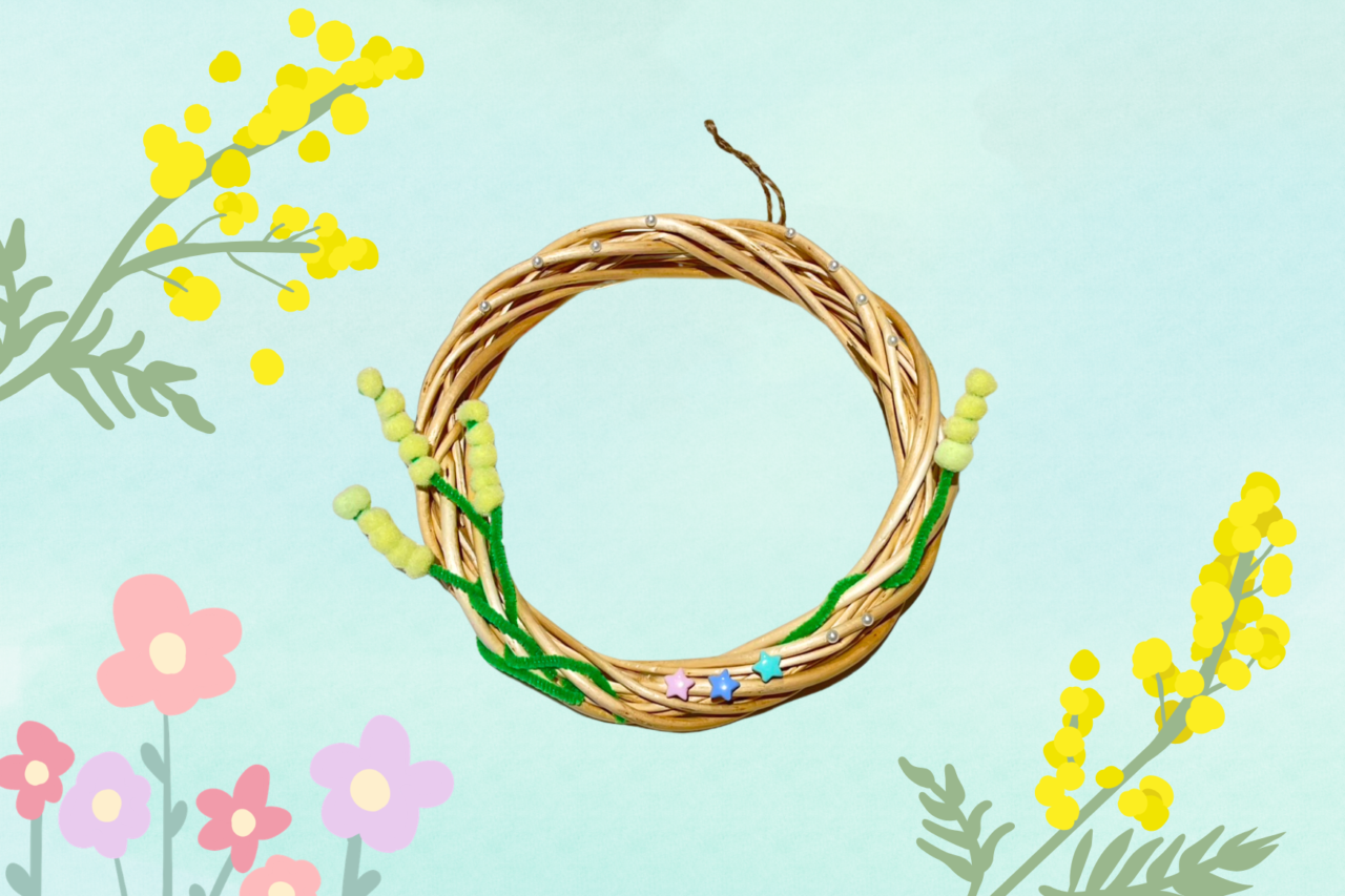 ふわふわのポンポンで春らしいミモザの花をつくり、リースにかざりつけします。 -